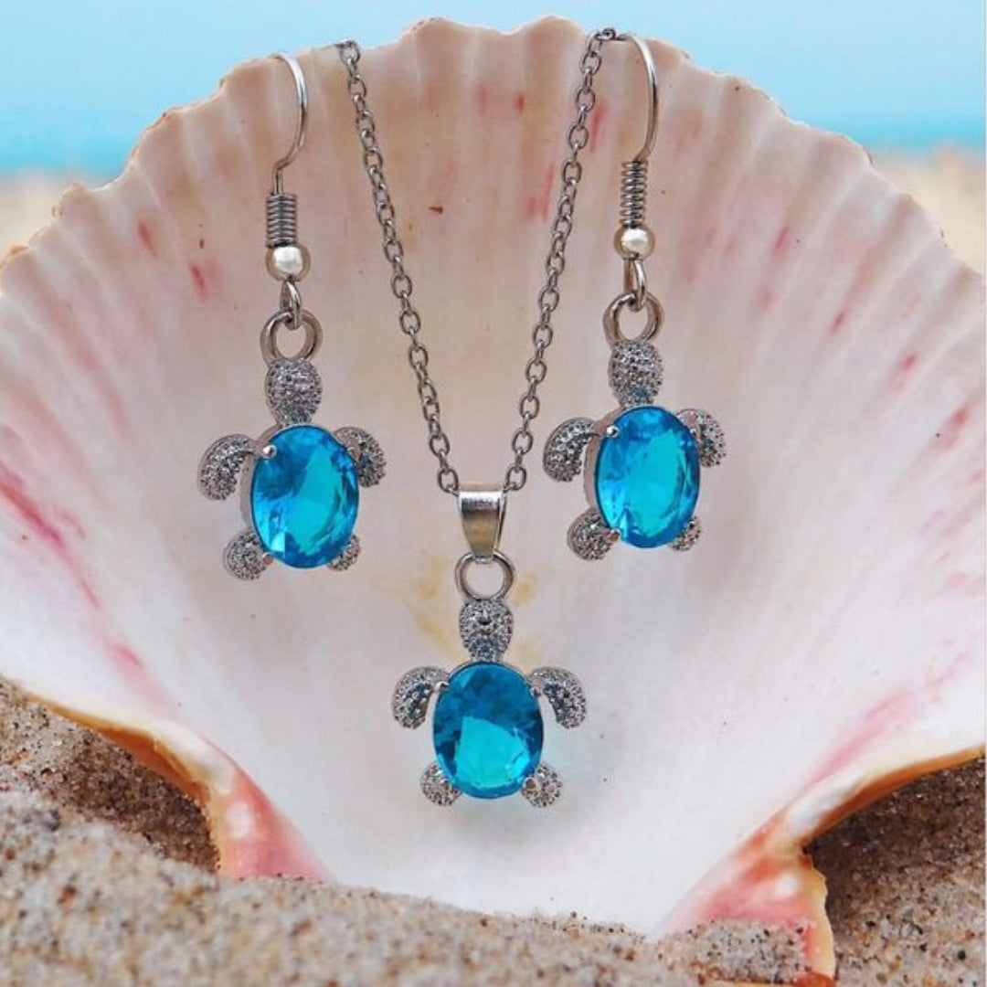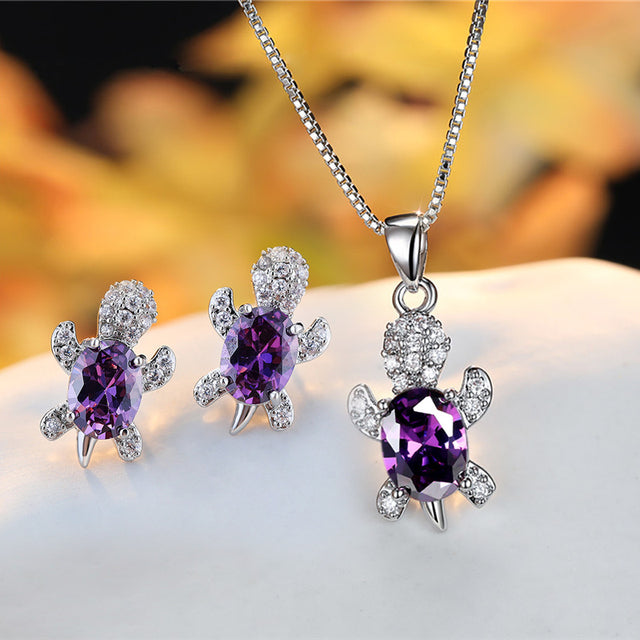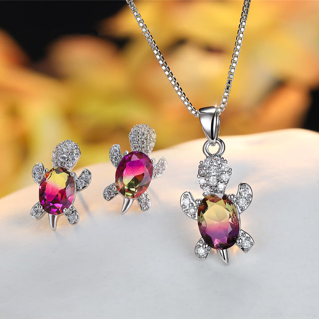 Set of Earrings + Necklace of Crystal Turtles with Zircons in Sterling Silver